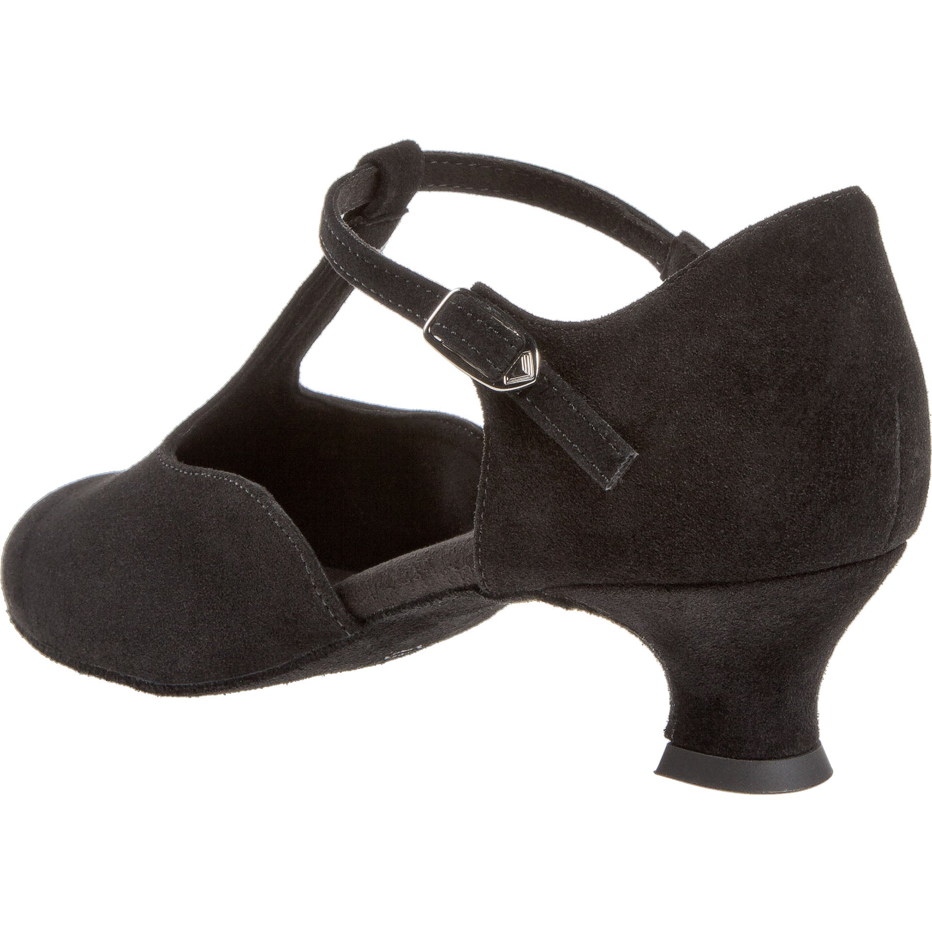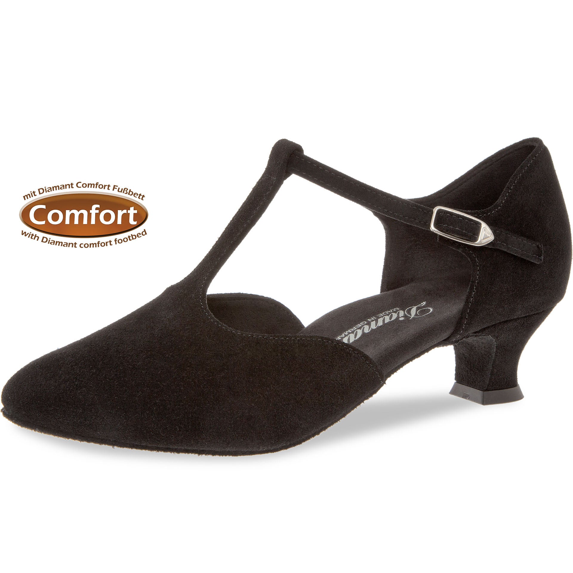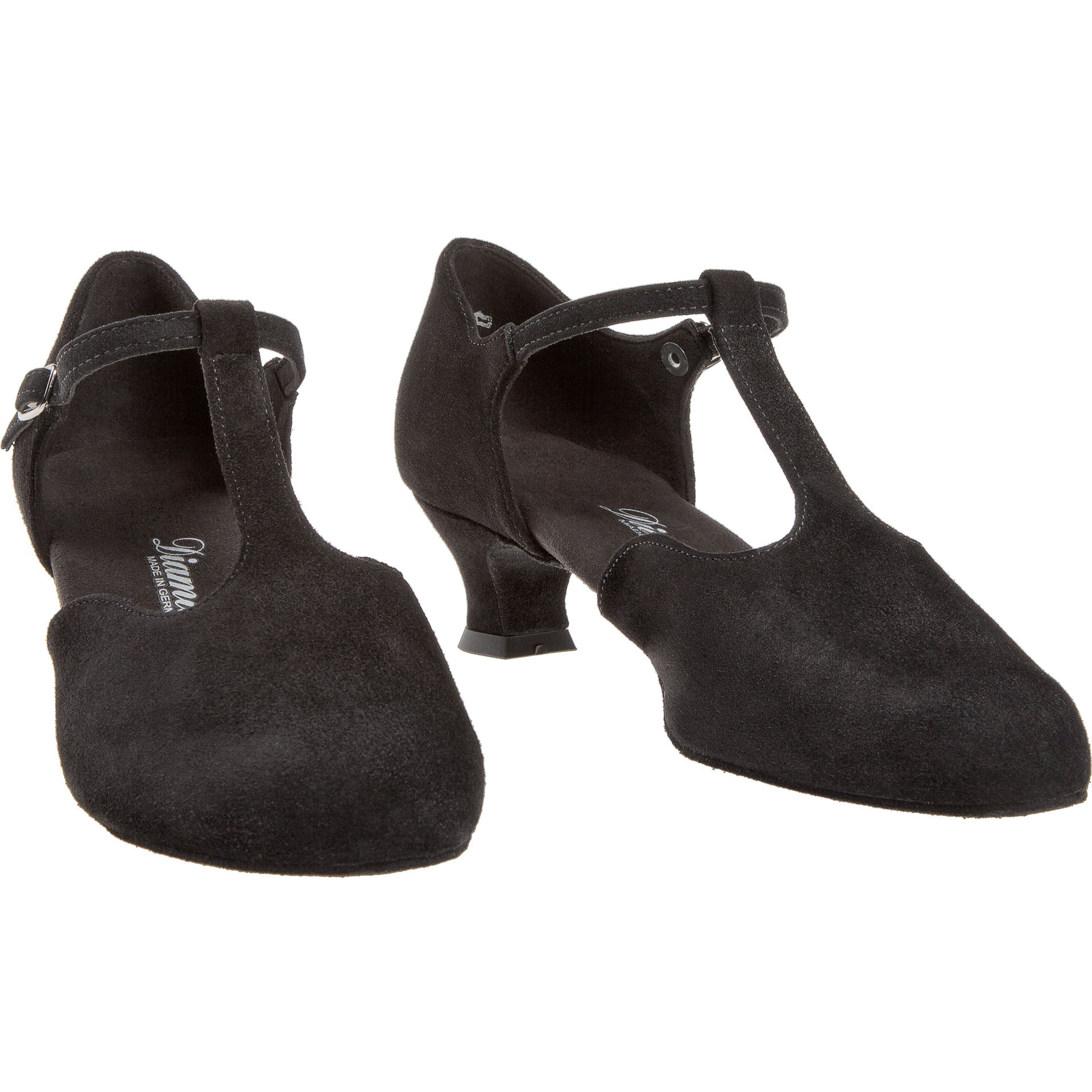 Diese handgefertigten Damen-Tanzschuhe aus Deutschland zeichnen sich durch einen T-Steg am Vorderblatt aus. Der geschlossene Pumps besitzt ein Fersenriemchen mit einer stufenlos verstellbaren Druckknopfschnalle, die ein schnelles Öffnen und Schließen ermöglicht. Speziell in der Weite G für kräftige Füße gefertigt, bieten sie ein Diamant Comfort Fußbett sowie einen stabilen 4,2 cm hohen Spanish Absatz mit großzügiger Auftrittsfläche. Die Innenauskleidung besteht aus atmungsaktivem, feuchtigkeitsabsorbierendem Microfaser italienischer Premiumqualität, während das Obermaterial aus weichem, schwarzem Velourleder aus Italien gefertigt ist.