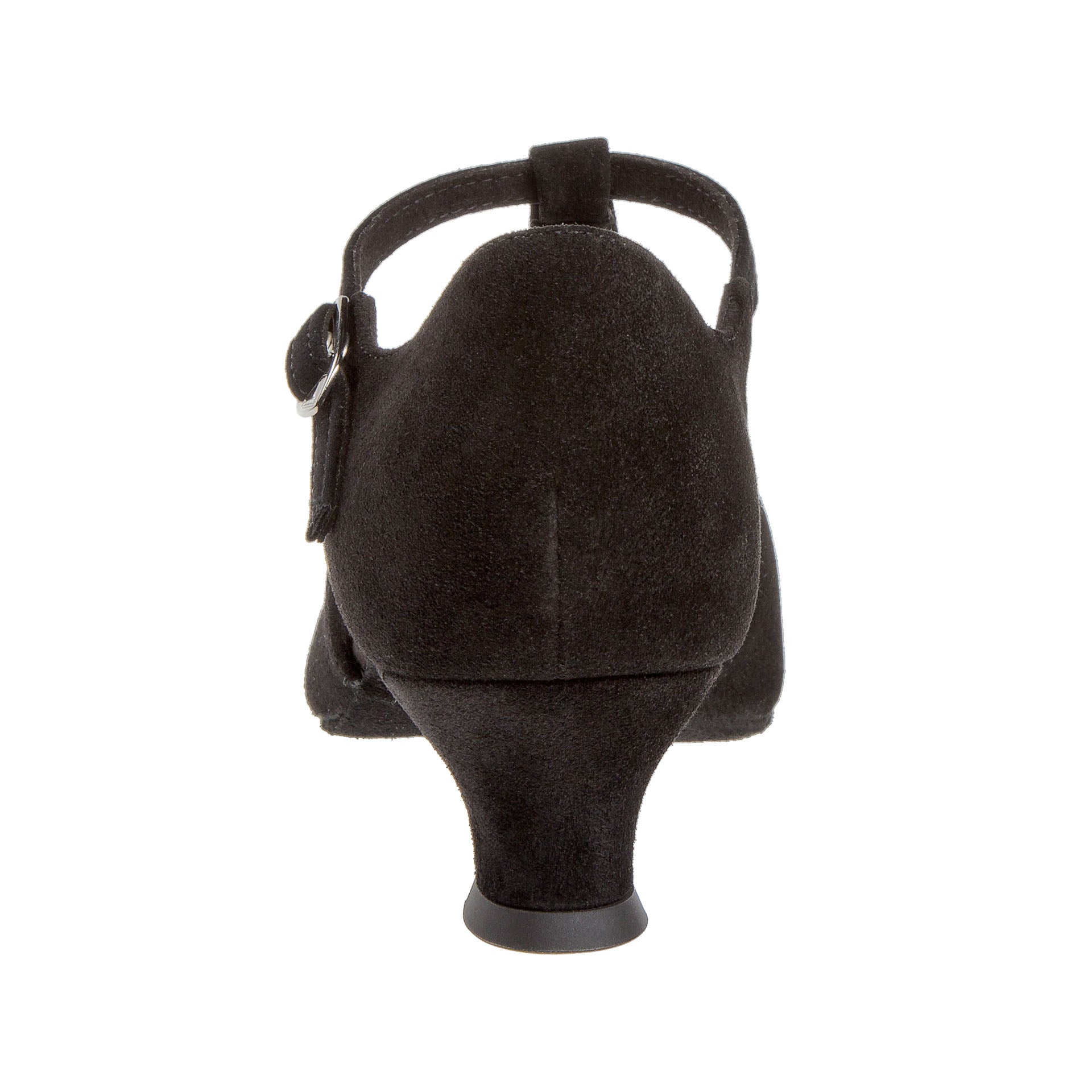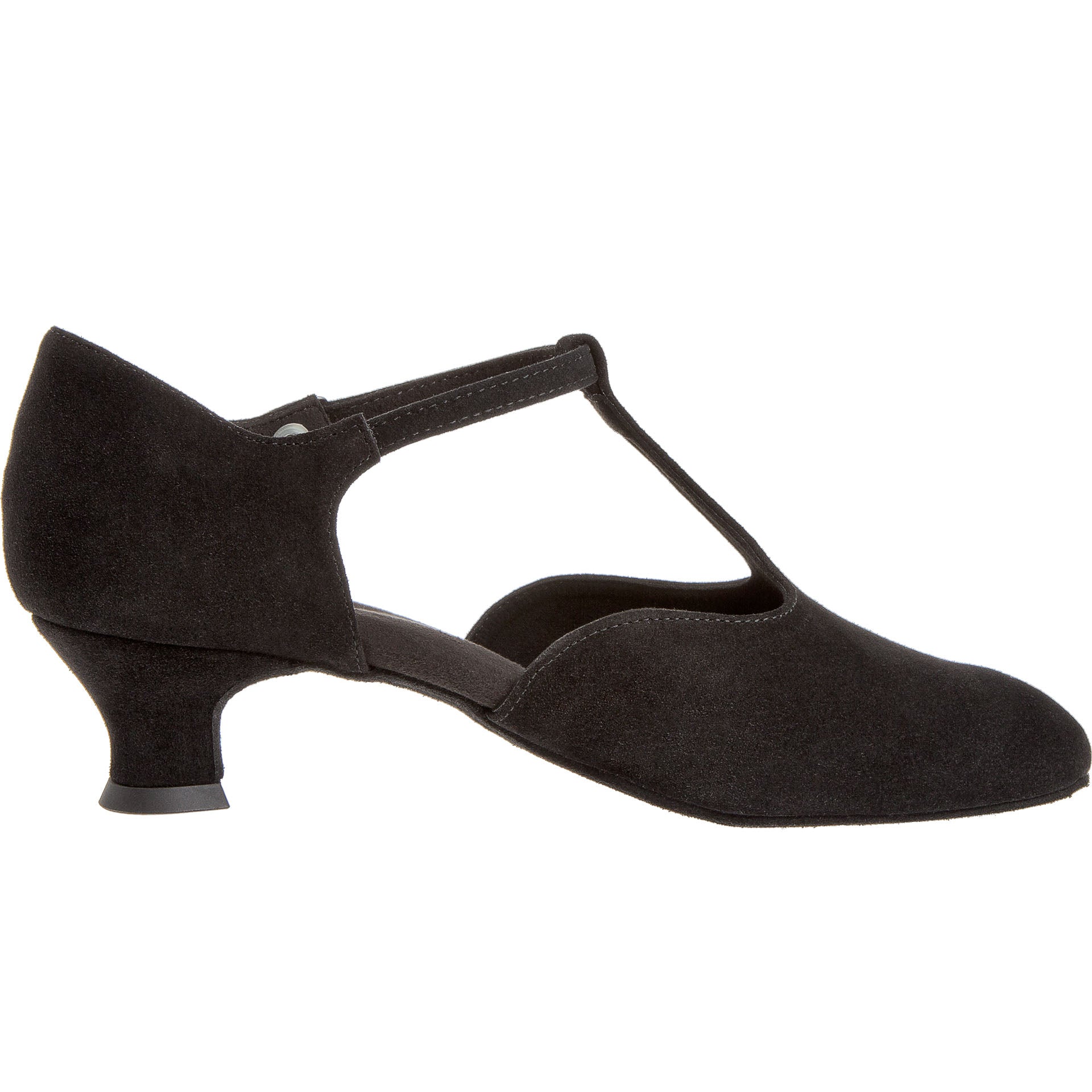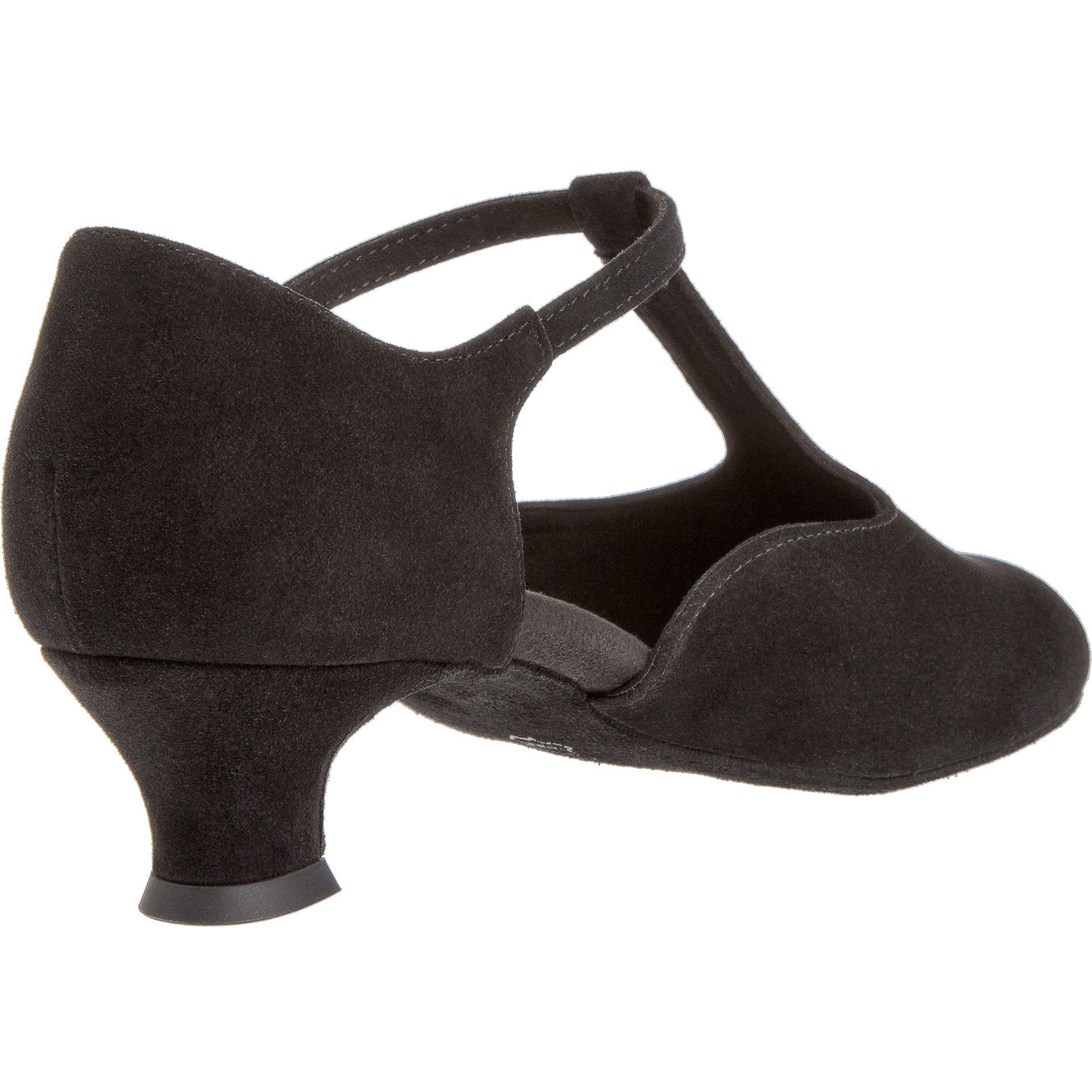 Diese handgefertigten Damen-Tanzschuhe aus Deutschland zeichnen sich durch einen T-Steg am Vorderblatt aus. Der geschlossene Pumps besitzt ein Fersenriemchen mit einer stufenlos verstellbaren Druckknopfschnalle, die ein schnelles Öffnen und Schließen ermöglicht. Speziell in der Weite G für kräftige Füße gefertigt, bieten sie ein Diamant Comfort Fußbett sowie einen stabilen 4,2 cm hohen Spanish Absatz mit großzügiger Auftrittsfläche. Die Innenauskleidung besteht aus atmungsaktivem, feuchtigkeitsabsorbierendem Microfaser italienischer Premiumqualität, während das Obermaterial aus weichem, schwarzem Velourleder aus Italien gefertigt ist.
