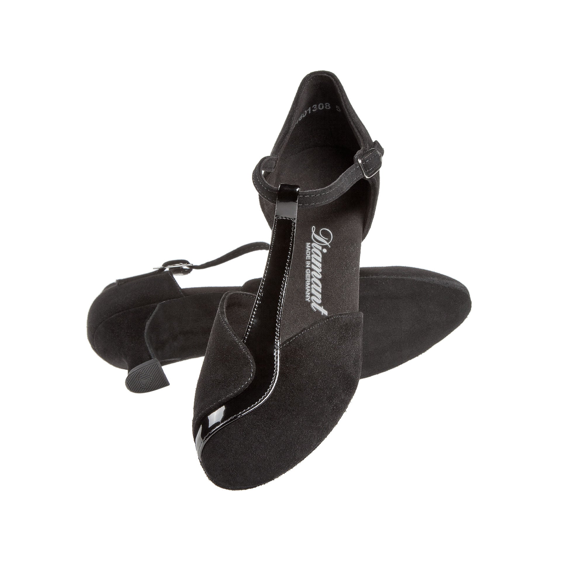Die Diamant Damen Standard Tanzschuhe, sorgfältig handgefertigt in Deutschland, zeichnen sich durch ihr durchdachtes Design und hochwertige Verarbeitung aus. Das wellenförmige Detail des T-Stegs, das elegant ins Vorderblatt übergeht, sorgt für eine perfekte Passform und unterstützt die Fußbewegung optimal. Der zehengeschlossene Pumps wird mit einem stufenlos einstellbaren Druckknopfschnallenverschluss am Fersenriemchen ausgestattet, der ein schnelles und bequemes An- und Ausziehen ermöglicht. Speziell in Weite G gefertigt, bietet der Schuh optimalen Sitz für kräftige Füße, während der stilvolle 5 cm Latino Absatz für eleganten Auftritt und nötige Stabilität beim Tanzen sorgt. Die Innenauskleidung aus italienischer Premium-Mikrofaser ist atmungsaktiv und absorbiert Feuchtigkeit, was zu einem angenehmen Klima im Schuh beiträgt und die Füße trocken hält. Das Obermaterial kombiniert hochwertiges, schwarzes Velourleder mit edlem schwarzen Lack, beide aus ausgewählten italienischen Materialien, die für eine weiche Haptik und langlebige Qualität stehen. Diese Tanzschuhe verbinden Design, Komfort und Funktionalität und sind die ideale Wahl für anspruchsvolle Tänzerinnen, die beim Standardtanz höchste Ansprüche an ihre Ausrüstung stellen.