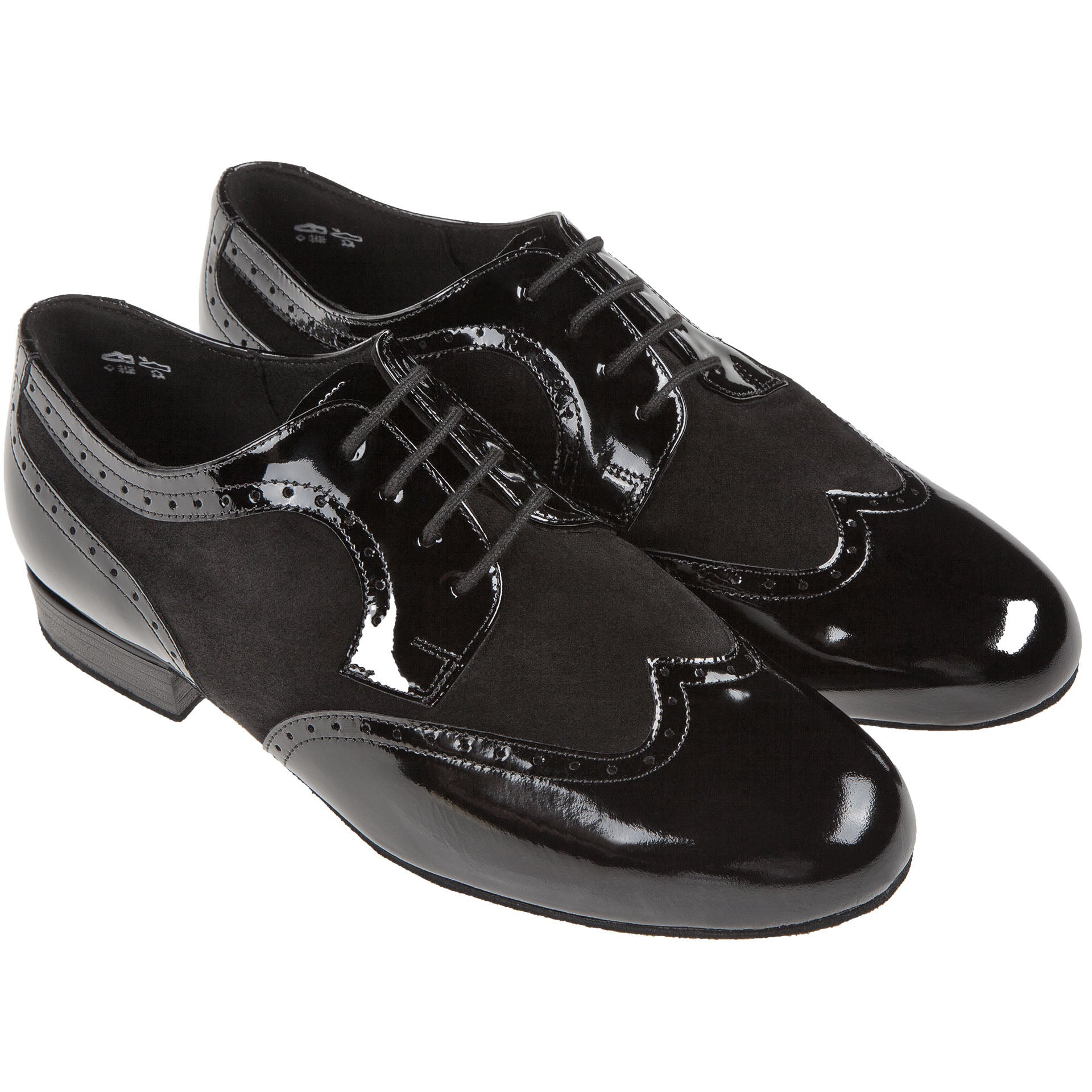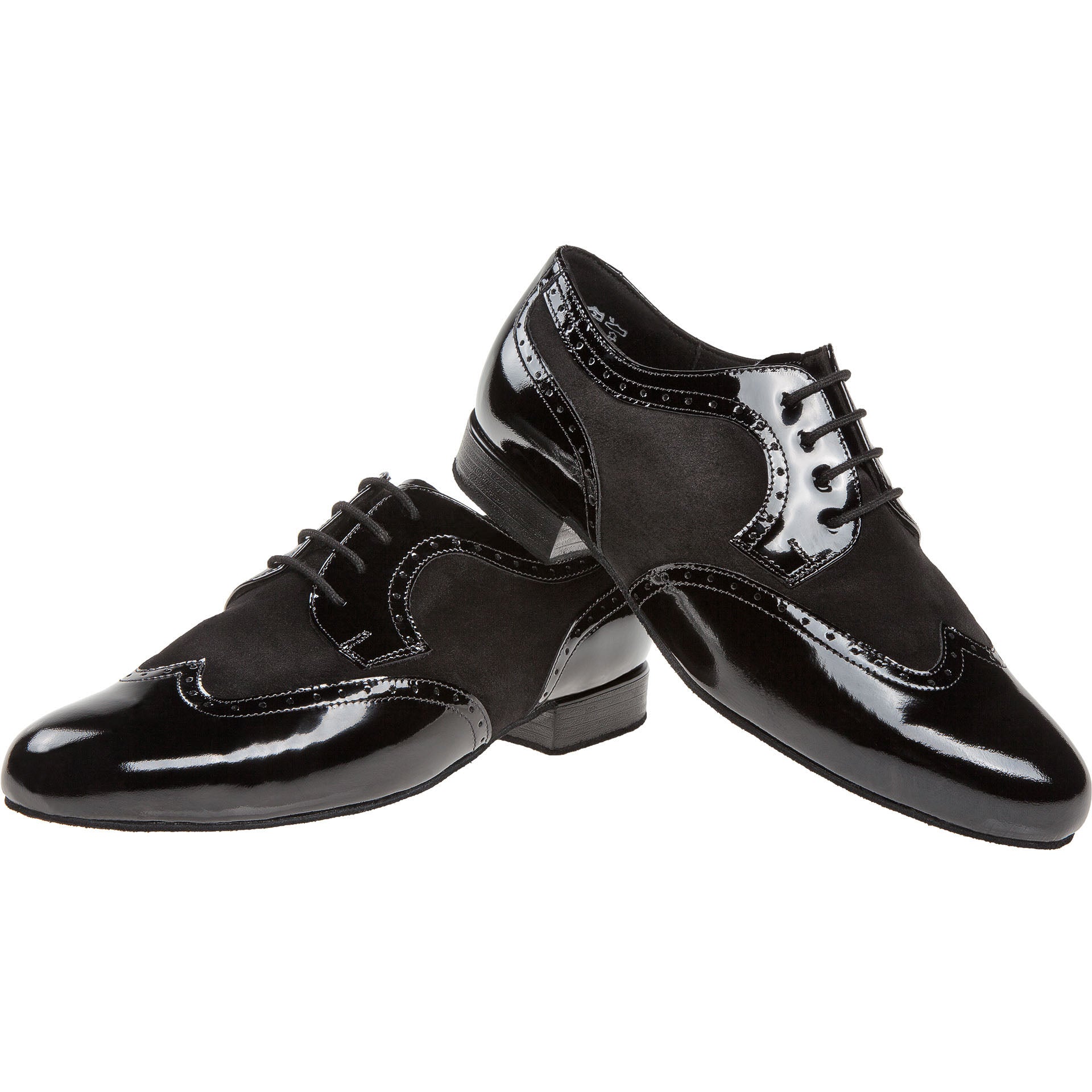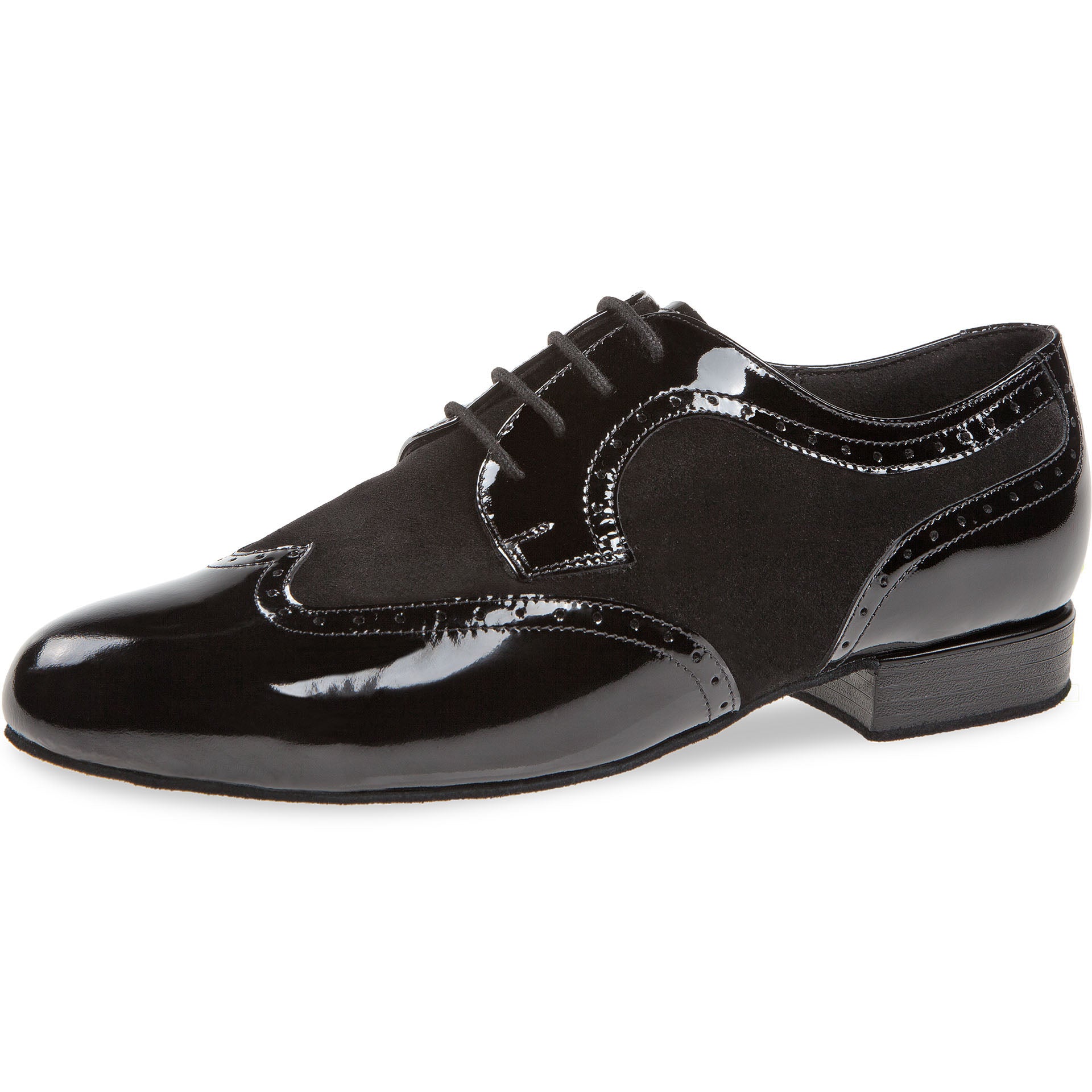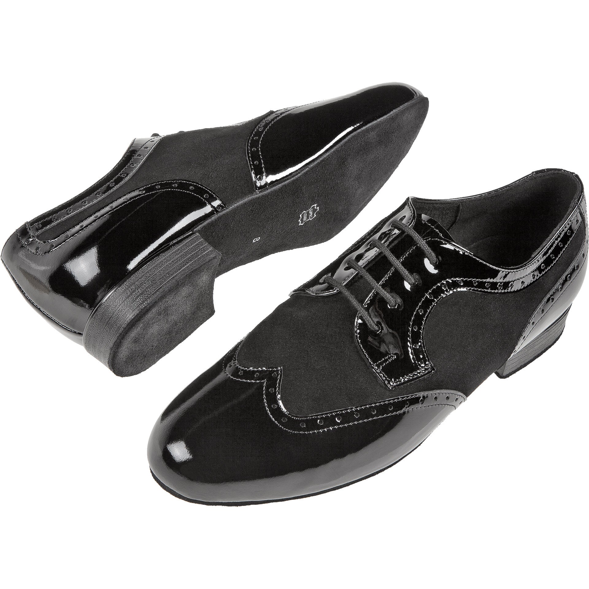 Dieser handgefertigte Tanzschuh von Diamant in Derby-Form zeichnet sich durch exzellente Verarbeitung und hochwertige Materialien aus. Die 4-Loch-Schnürung garantiert festen Halt, während das Innenfutter aus italienischer Mikrofaser für eine optimale Atmungsaktivität und Feuchtigkeitsregulierung sorgt. Der 2 cm hohe Absatz sorgt für eine angenehme Fersendämpfung. Das Obermaterial vereint schwarzes Lackleder mit schwarzem Velours und bietet so eine elegante Optik bei gleichzeitig hoher Langlebigkeit.