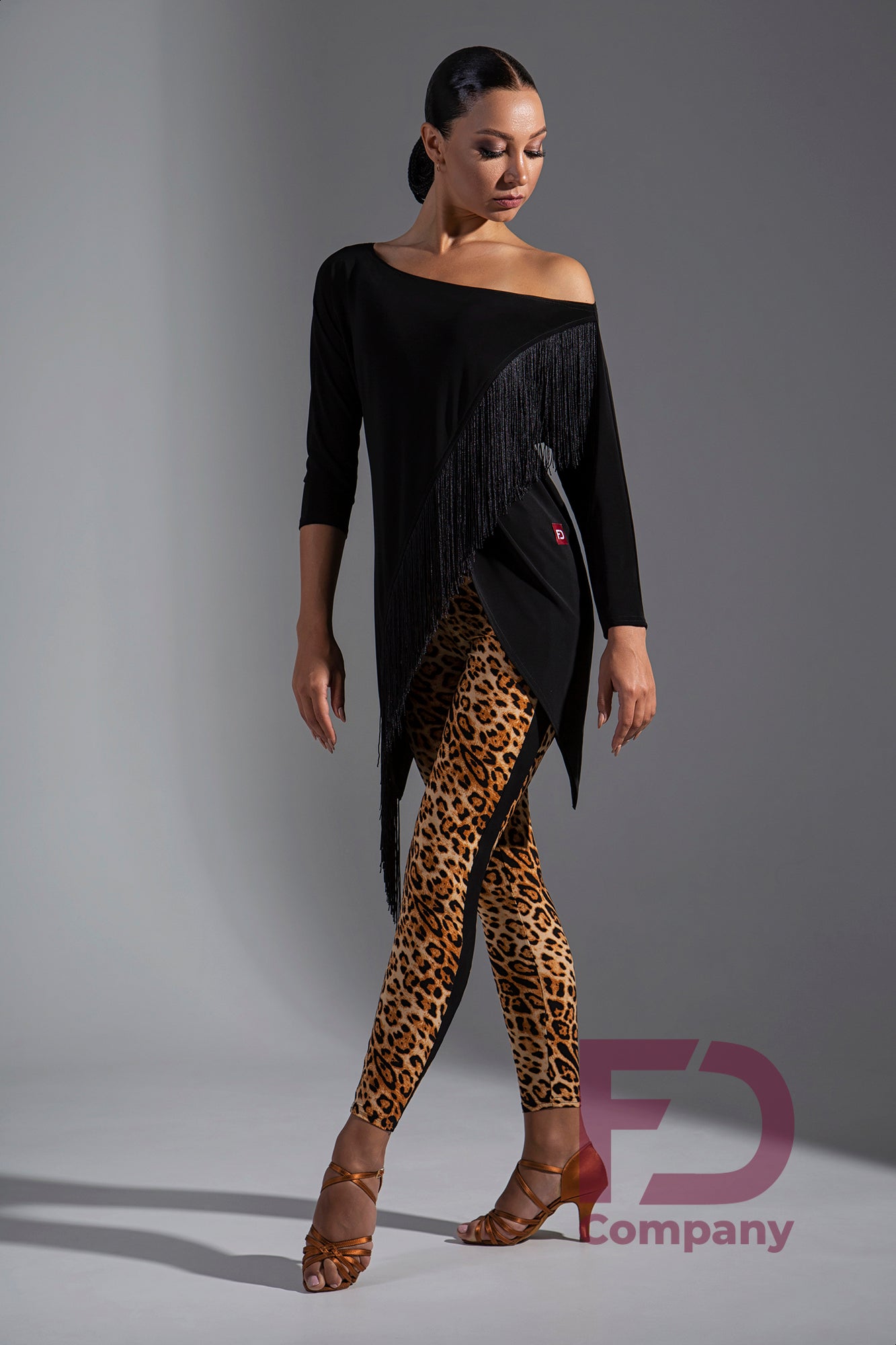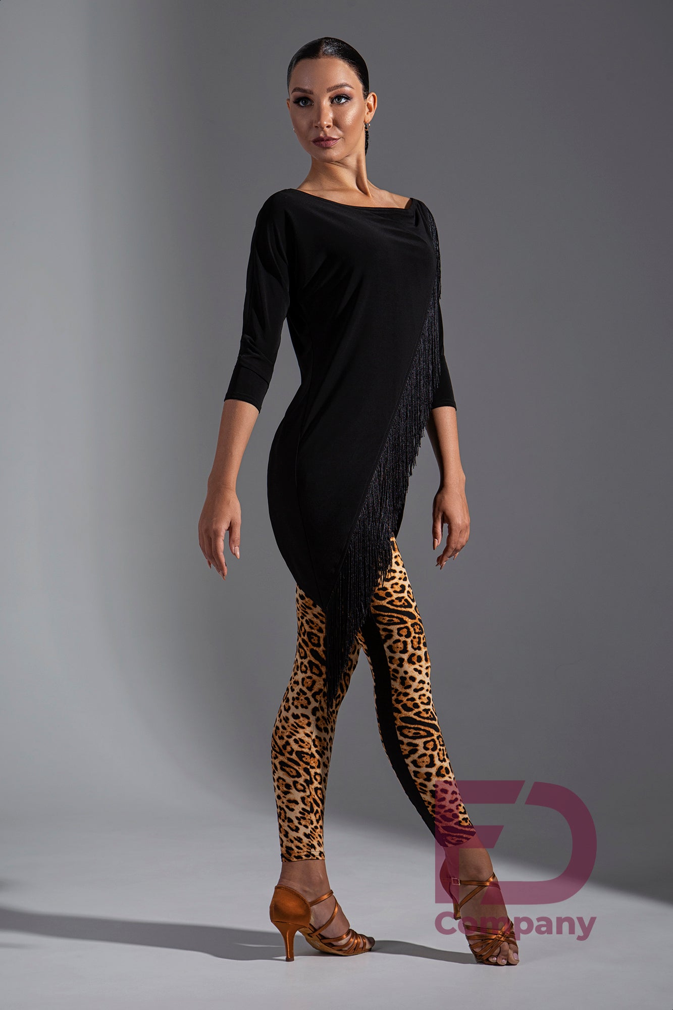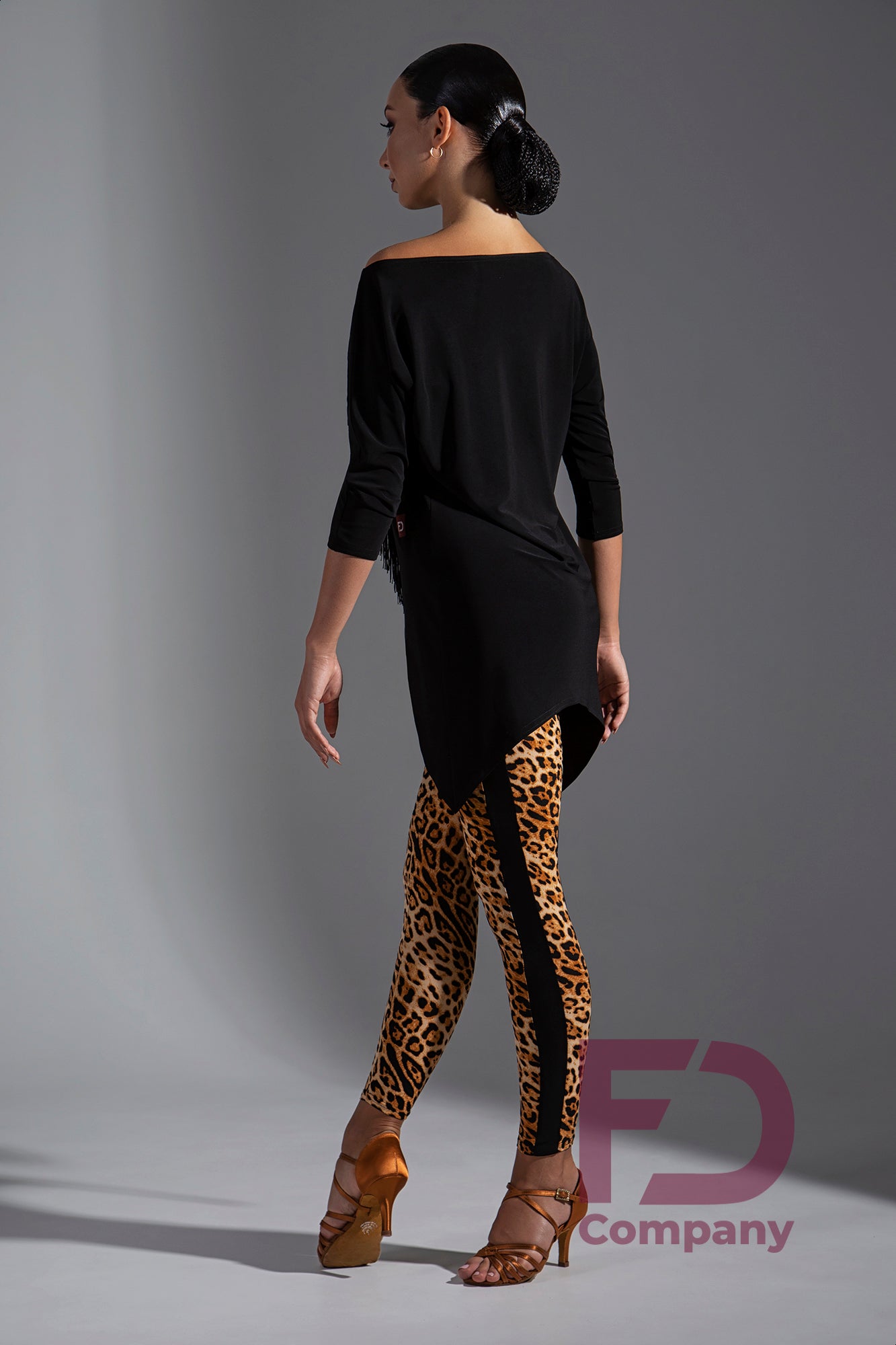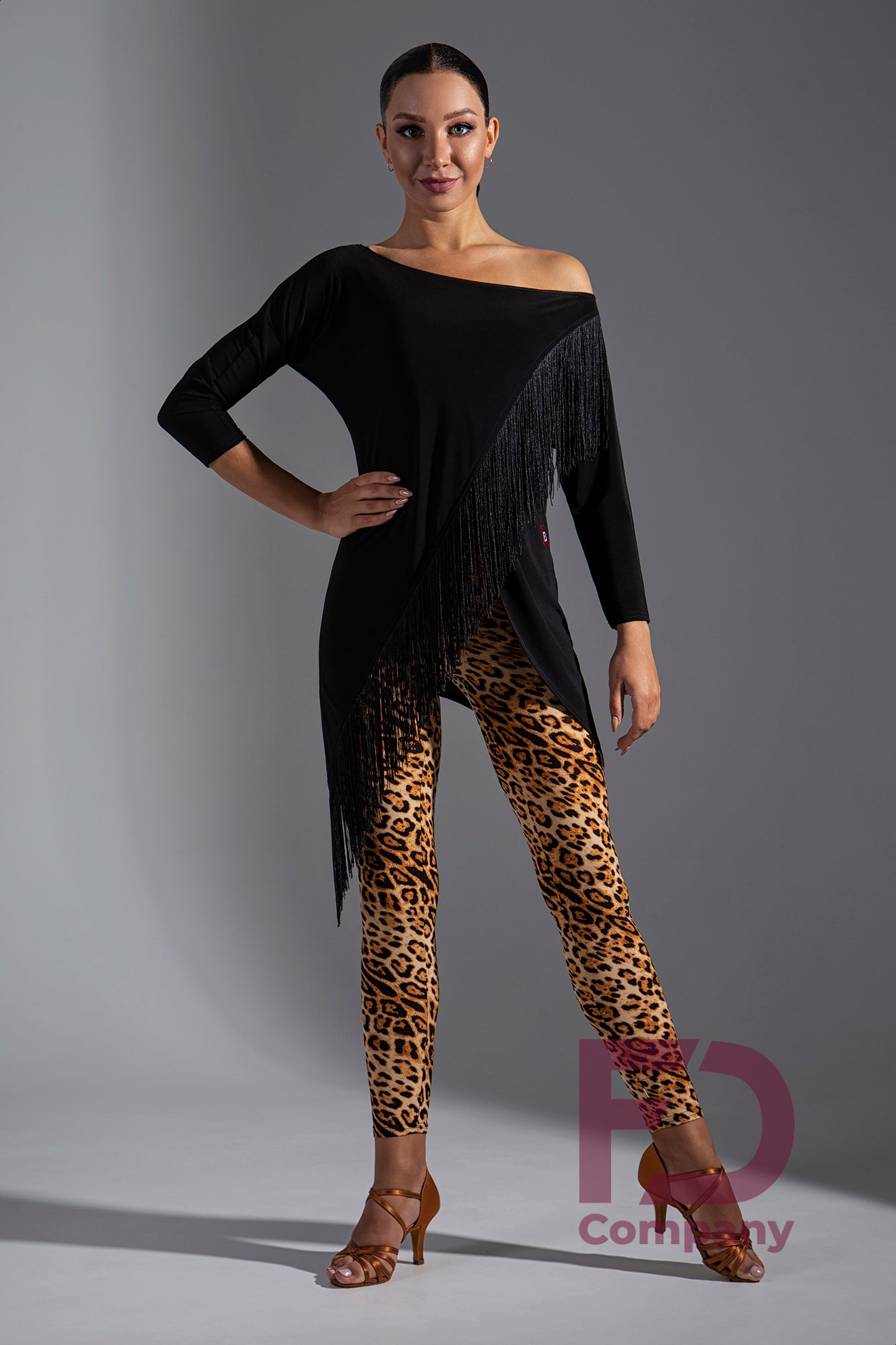 Diese Damen-Tunika präsentiert sich mit dreiviertellangen Ärmeln und einem Bootsausschnitt. Der Saum verläuft asymmetrisch, ergänzt durch einen 20 cm langen Fransenbesatz am Rand des rechten Vorderteils. Das Modell ist aus hochwertigem Öltrikot gefertigt..