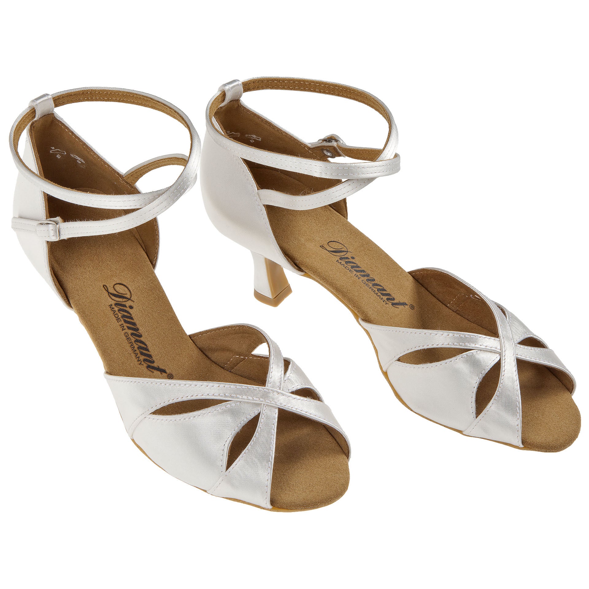 Diese exquisiten Diamant Damen Latein Tanzschuhe werden in Deutschland handgefertigt und zeichnen sich durch ein raffiniertes Vorderblatt mit drei übereinander liegenden Flügeln aus, die sich sanft an die Form Ihres Fußes anpassen. Die offene Zehenpartie sorgt für optimale Bewegungsfreiheit, während die stufenlos einstellbare Druckknopfschnalle, befestigt an einem überkreuzenden Fersenriemchen, ein schnelles An- und Ausziehen ermöglicht. Gefertigt in der eleganten Normalweite F, bestechen die Schuhe durch einen stilvollen 6,5 cm Flare-Absatz, der besonders für Lateintänze und ihren Hochzeitstanz ideal ist. Das Innenfutter besteht aus hochwertiger, atmungsaktiver und feuchtigkeitsabsorbierender italienischer Mikrofaser, die für ein angenehmes Tragegefühl sorgt. Das Obermaterial aus edlem weißem Satin stammt von einem erstklassigen englischen Stofflieferanten und verleiht den Schuhen eine zeitlose Eleganz. Diese Tanzschuhe verbinden meisterhafte Handwerkskunst mit erstklassigen Materialien und bieten so höchsten Tragekomfort und stilvolle Performance für anspruchsvolle Tänzerinnen.
