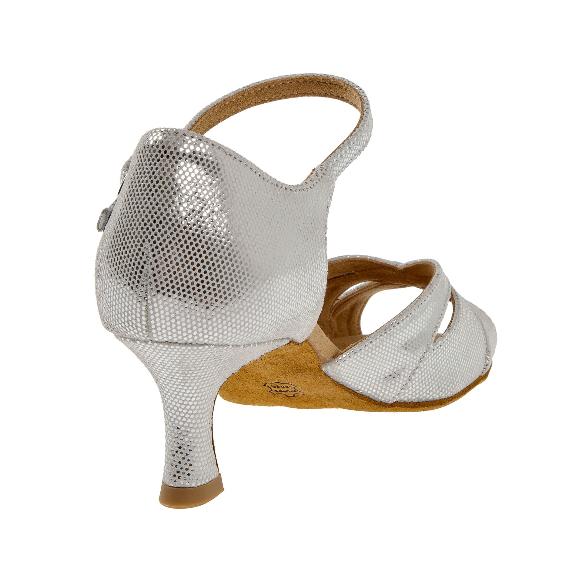 Handgefertigt in Deutschland, überzeugen die Diamant Damen Latein Tanzschuhe mit einem Vorderblatt, das aus zwei übereinander liegenden Flügeln besteht und sich optimal an den Fuß anschmiegt. Die zehenoffene Sandalette verfügt über eine stufenlos verstellbare Druckknopfschnalle am Fersenriemchen für schnelles An- und Ausziehen. Dieser Tanzschuh in Normalweite F hat einen eleganten 5 cm Flare-Absatz. Das Innenfutter besteht aus atmungsaktivem, feuchtigkeitsabsorbierendem Microfaser italienischer Premiumqualität. Für das Obermaterial wird weiß-silbernes Puntino Leder mit weichem italienischem Velourleder und edlem Foliendruck verwendet.