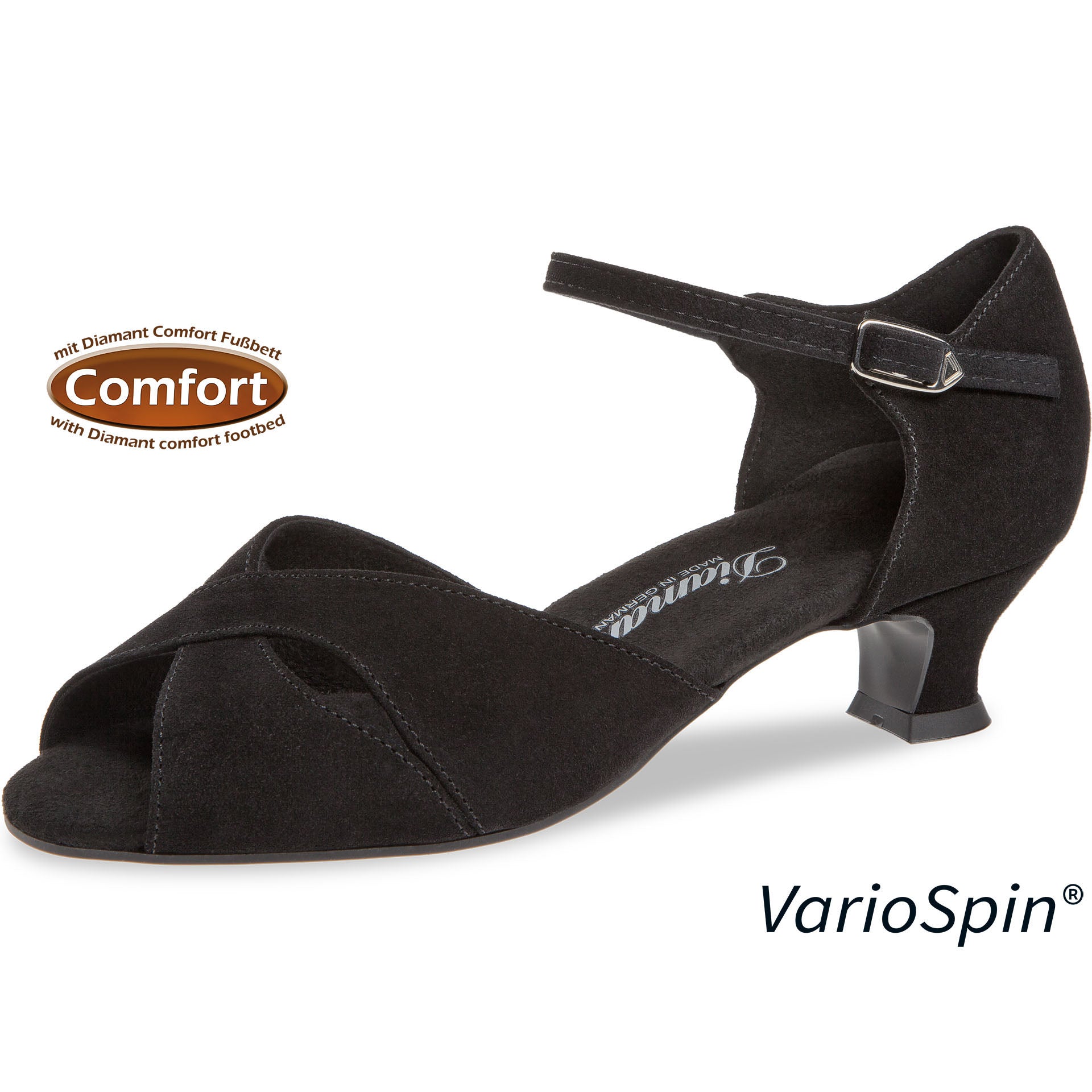 Die Diamant Damen Latein Tanzschuhe, gefertigt in Deutschland, zeichnen sich durch ein handgearbeitetes Vorderblatt aus zwei überlappenden Flügeln aus, die sich optimal an den Fuß anschmiegen. Die offene Zehensandalette verfügt über eine stufenlos verstellbare Druckknopfschnalle am Fersenriemchen für ein schnelles An- und Ausziehen. In der Normalweite F bietet der Schuh ein komfortables Diamant Comfort Fußbett sowie einen stabilen 4,2 cm hohen Spanish Absatz mit großzügiger Auftrittsfläche. Das Innenfutter besteht aus atmungsaktivem, feuchtigkeitsabsorbierendem Mikrofaser italienischer Premiumqualität, während das Obermaterial aus weichem, schwarzem Velourleder aus Italien gefertigt ist.