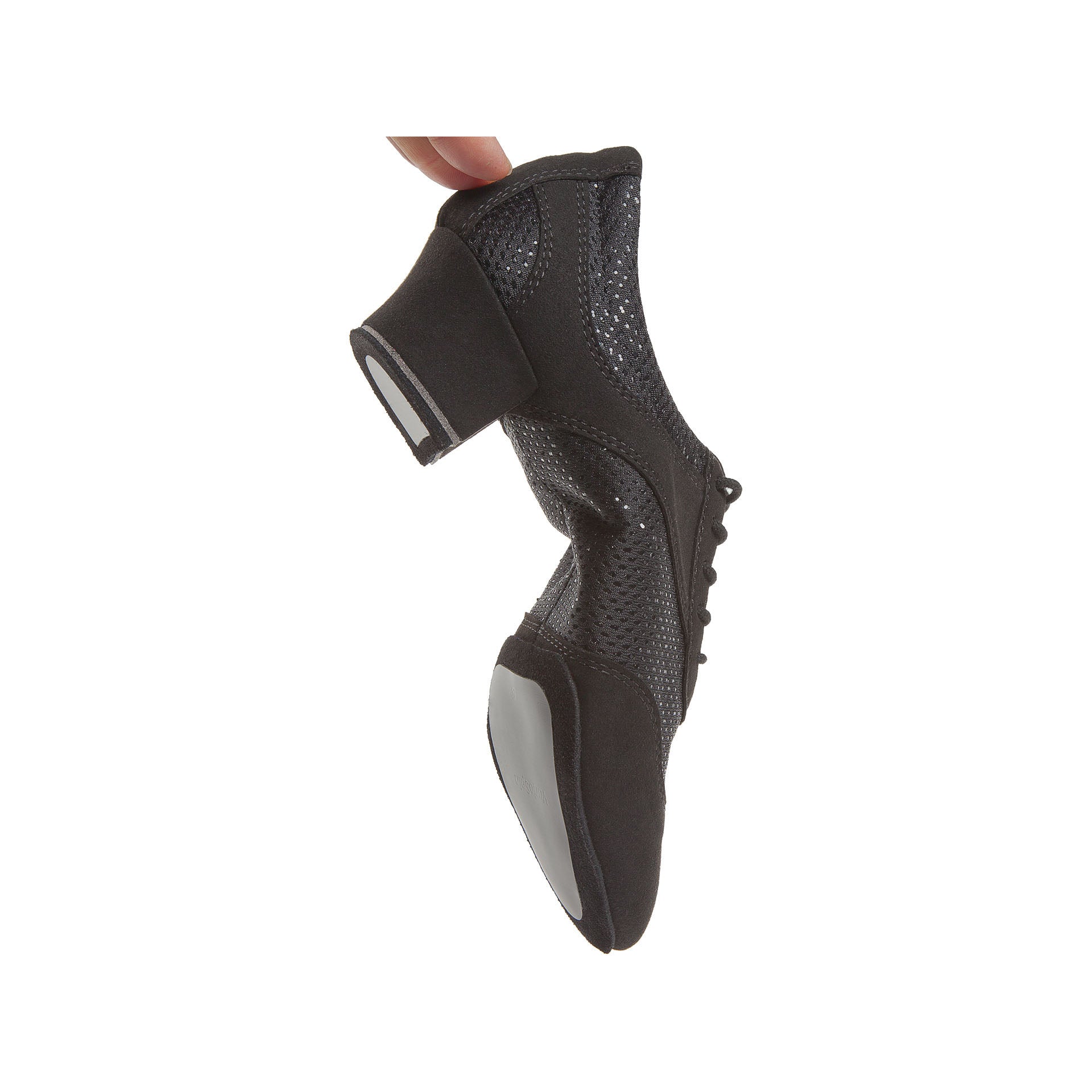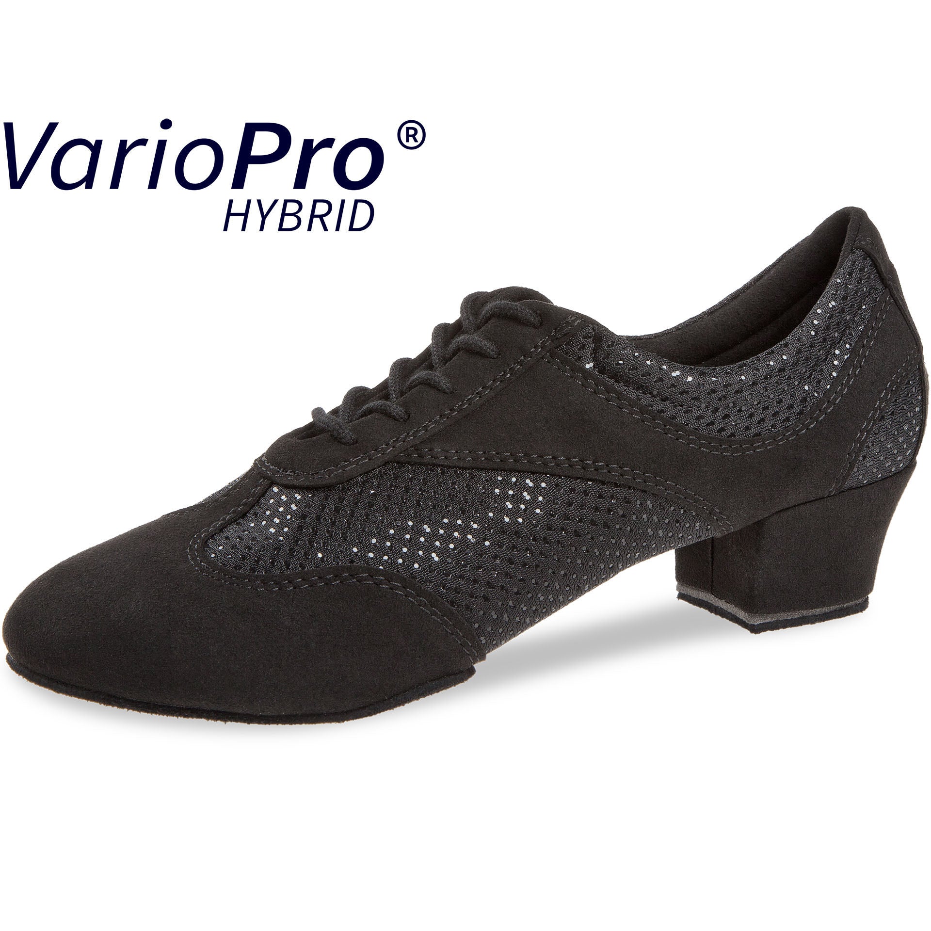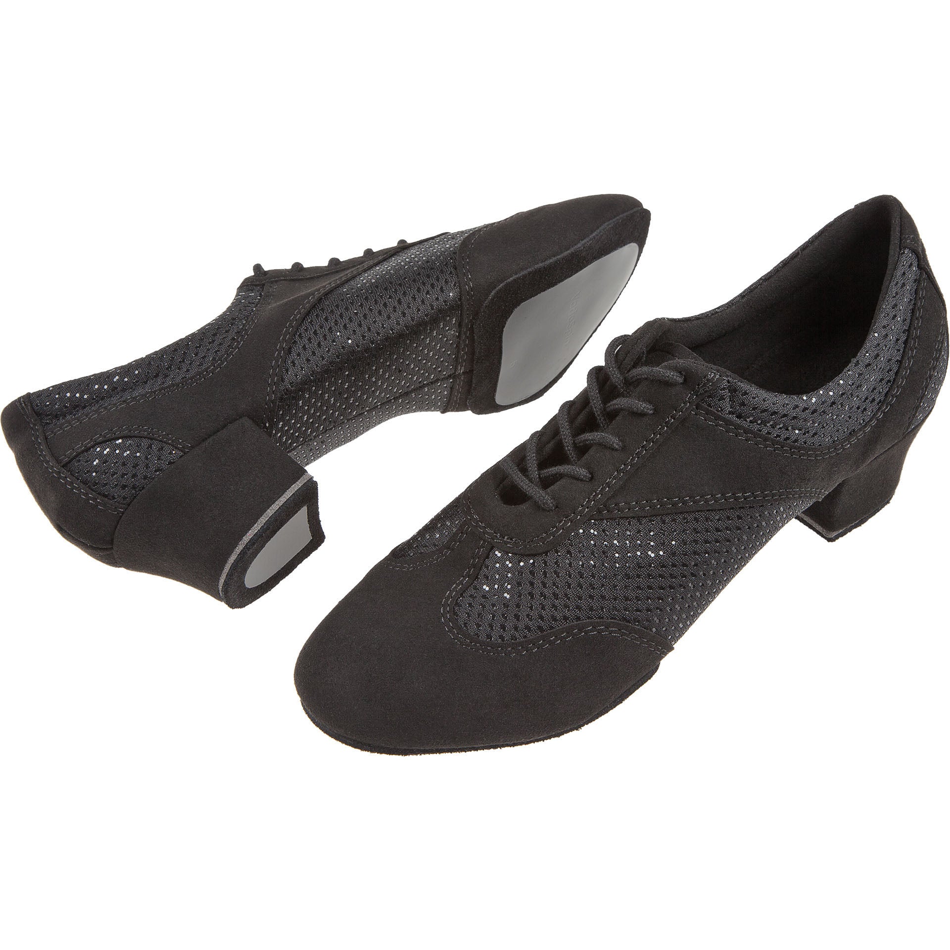 Der Diamant Damen Trainer Tanzschuh wird in Deutschland handgefertigt und bietet eine hochwertige Ausführung für das Turniertraining. Mit einer 5-Loch-Schnürung und einem gepolsterten Schaftrand sorgt dieser flexible VarioPro Schuh in der Weite F (Normalweite) für sicheren Halt. Die geteilte Hybrid-Laufsohle und das Multiflex-Fußbett mit einem schockdämpfenden 3,7 cm Latein Absatz gewährleisten optimalen Komfort und Unterstützung. Das innenliegende, atmungsaktive Mikrofasermaterial aus italienischer Premium-Herstellung absorbiert Feuchtigkeit. Das Obermaterial kombiniert schwarzen, mit funkelnden Pailletten besetzten Glitzer und Microfaser aus hochwertigen italienischen und englischen Materialien.